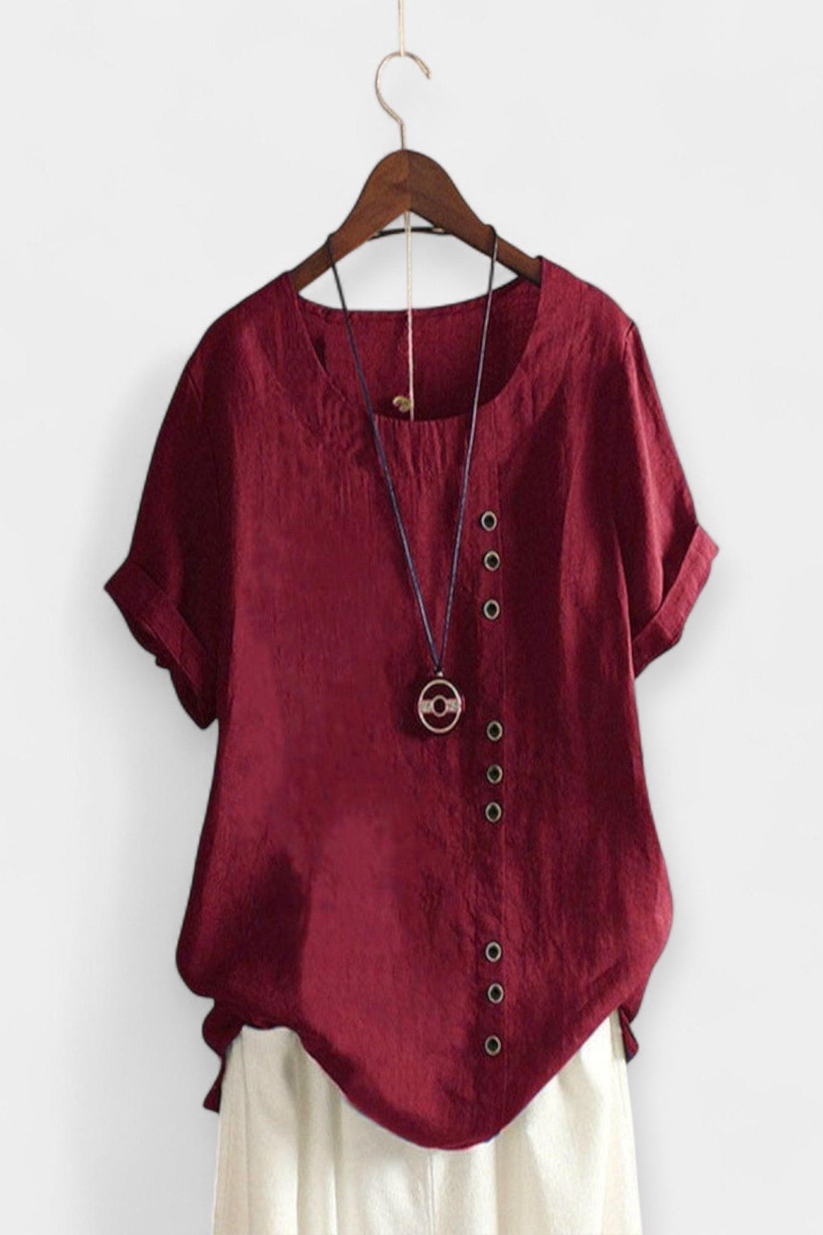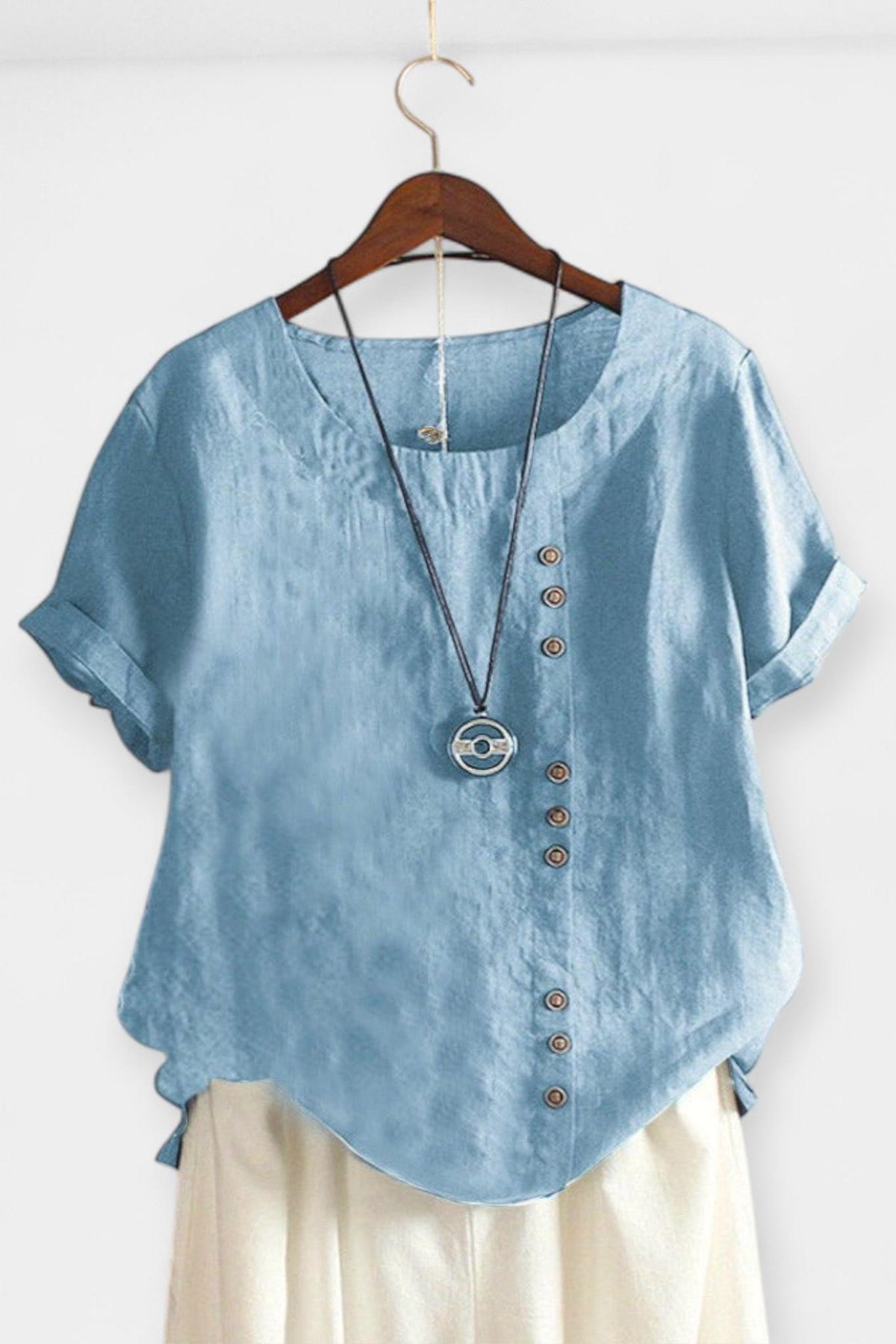 Opdag Tilde | Kortærmet bluse, en signatur af raffinement gennem håndværk og omtanke for oprindelse. Denne ensfarvede bluse med rund hals og diskrete knapper forener tidløs enkelhed med en fin finish, skabt i premium materialer og produceret i begrænset antal for eksklusivitet og samlerværdi. Den åndbare pasform og de korte ærmer sikrer komfort hele dagen, mens den klassiske silhuet og klare farve giver en moderne luksus, der står stærkt i garderoben gennem årene. Tilde er mere end en bluse; den er en varig investering i stil og omtanke.