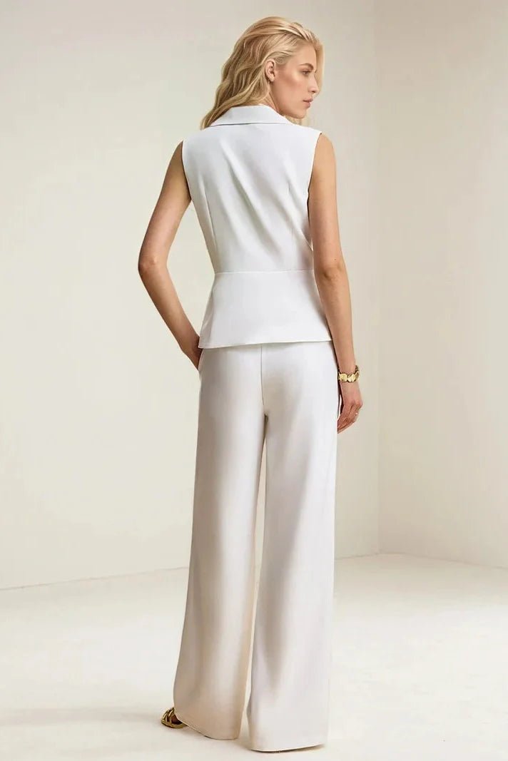 Silje | Sæt udstråler moderne luksus gennem en tidløs, kontureret silhuet. Den eksklusive ærmerfri vest og de brede bukser skaber en ren, sofistikeret helhed, der tåler tidens prøve. Sættet i en ren hvid nuance udstråler selvtillid og raffinement og passer både til særlige øjeblikke og til en stilfuld arbejdsdag. Det lette, strukturerede stof falder elegant og giver komfort hele dagen, mens rynkefrit materiale bevarer et skarpt look gennem tiden. Med begrænset tilgængelighed og en udødelig arv af håndværk lover Silje | Sæt stærk samlerappel: en investering i kvalitet og omtanke.