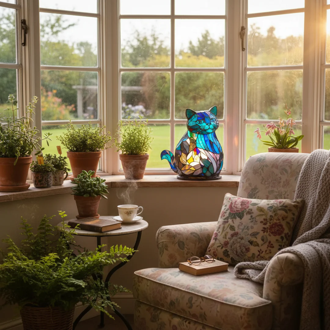 Den charmerende kat bringer liv og farver ind i din indretning og skaber en rolig og hyggelig atmosfære, perfekt til både stue, soveværelse eller læsehjørne.